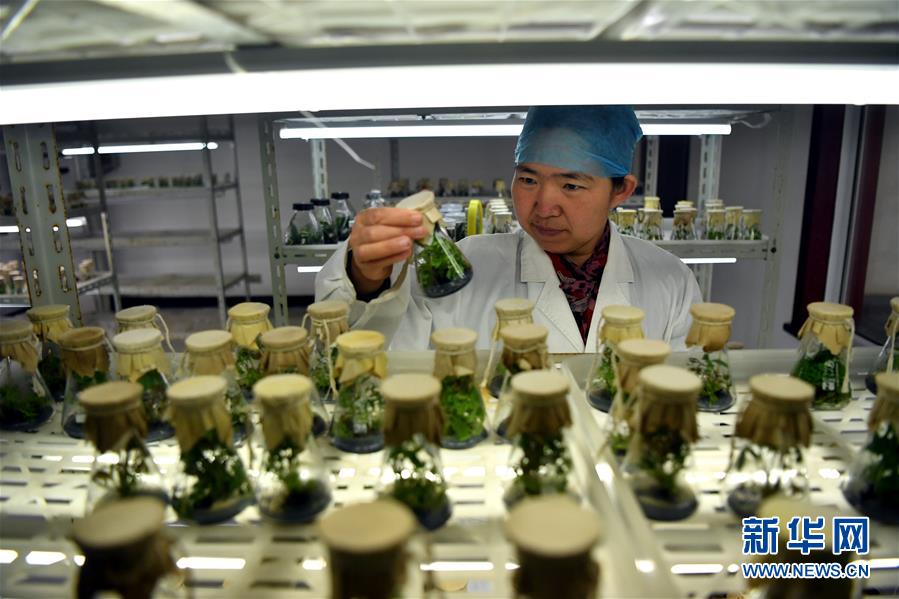 工作人員在洛陽國家牡丹園組織培養室中觀察牡丹組織培養苗生長情況(4月24日攝)。新華社記者 李嘉南 攝