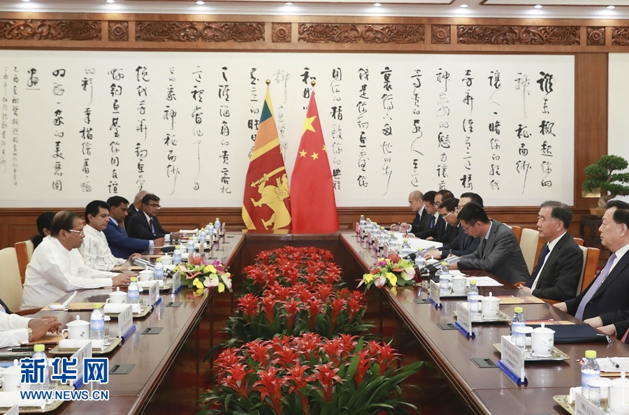 5月14日,全國(guó)政協(xié)主席汪洋在北京釣魚(yú)臺(tái)國(guó)賓館會(huì)見(jiàn)斯里蘭卡總統(tǒng)西里塞納。 新華社記者 丁林 攝