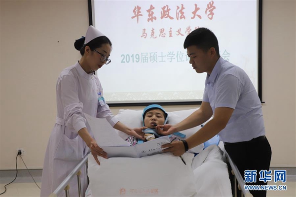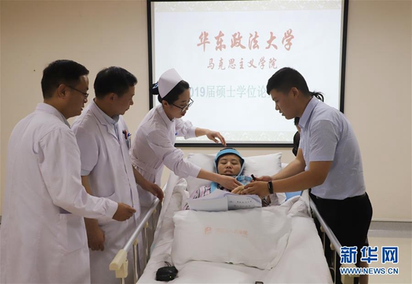 6月2日,程艷芳(中)在醫(yī)護人員和弟弟的幫助下進行畢業(yè)論文答辯。新華社發(fā)