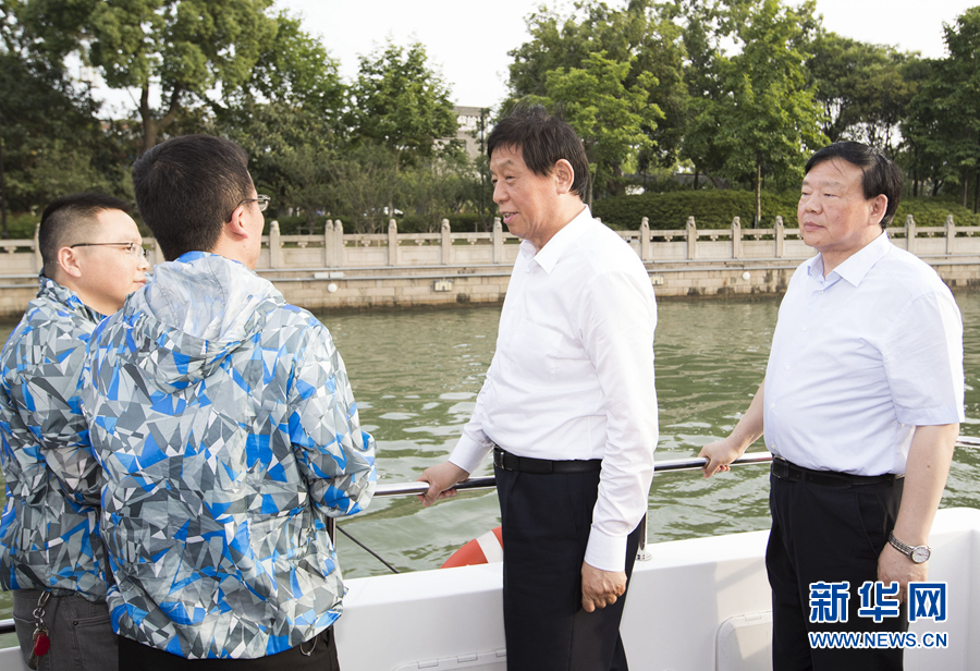 6月3日至6日,中共中央政治局常委、全國人大常委會委員長栗戰書率領全國人大常委會執法檢查組在江蘇檢查水污染防治法實施情況。這是6月5日,栗戰書在蘇州了解護城河現場取水檢測情況。 新華社記者黃敬文攝