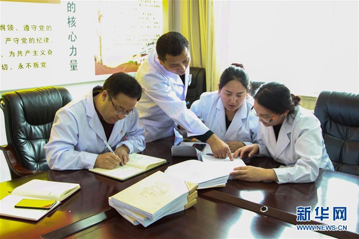 這是來自北京的援青干部劉云軍(左一)和醫院職工討論工作(資料照片)。新華社發