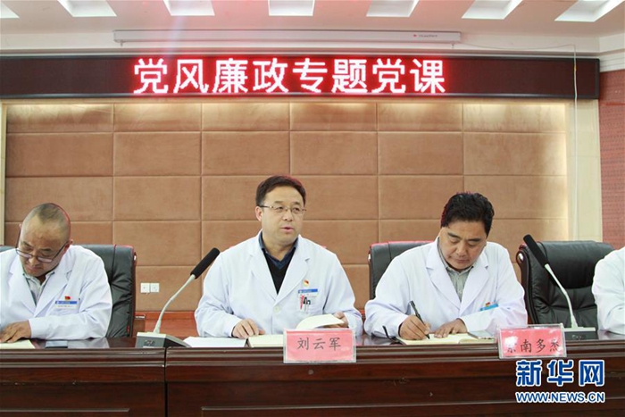 這是來自北京的援青干部劉云軍(中)在黨風廉政專題黨課上(資料照片)。新華社發