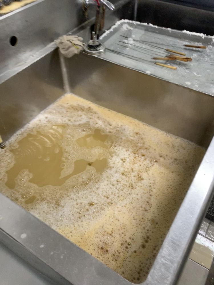 一樓洗碗間,已經被油污污染發黃的洗潔精水池。圖片來源:新華社客戶端