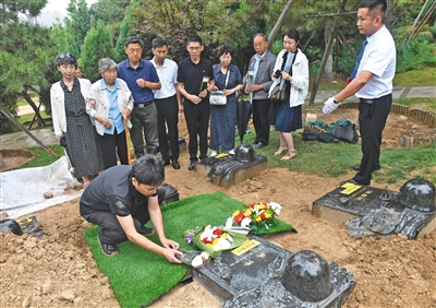 昨日早晨8點,在親屬陪伴下,第250份烈士骨灰由八寶山革命公墓烈士骨灰堂遷葬至公墓新建的烈士紀念園。按計劃,革命公墓烈士骨灰堂現存的680份骨灰將于本月底前完成遷葬。