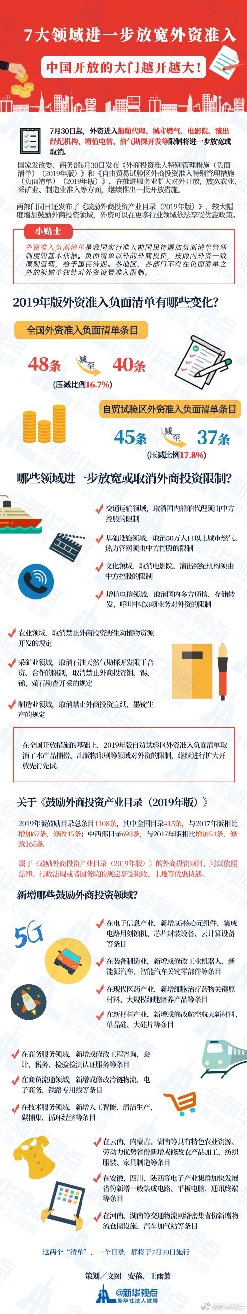 7月30日起,外資進入船舶代理、城市燃氣、電影院、演出經紀機構、增值電信、油氣勘探開發等限制將進一步放寬或取消。國家發改委、商務部6月30日發布《外商投資準入特別管理措施(負面清單)(2019年版)》,清單條目由48條減至40條。同日發布的《自由貿易試驗區外商投資準入特別管理措施(負面清單)(2019年版)》條目由45條減至37條。(記者安蓓、王雨蕭)?
