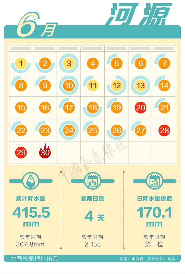 河源:廣東河源6月累計降水量達415.5毫米,比常年同期307.8毫米偏多近35%,30天中有23天在下雨,其中暴雨日數為4天,比常年同期2.4天偏多。日降水極值170.1毫米打破歷史記錄極值。(專家顧問:舒文軍 馬悅 蘇軼 高帆 蔣運志 李蒙 單雪珂 記者 申敏夏)