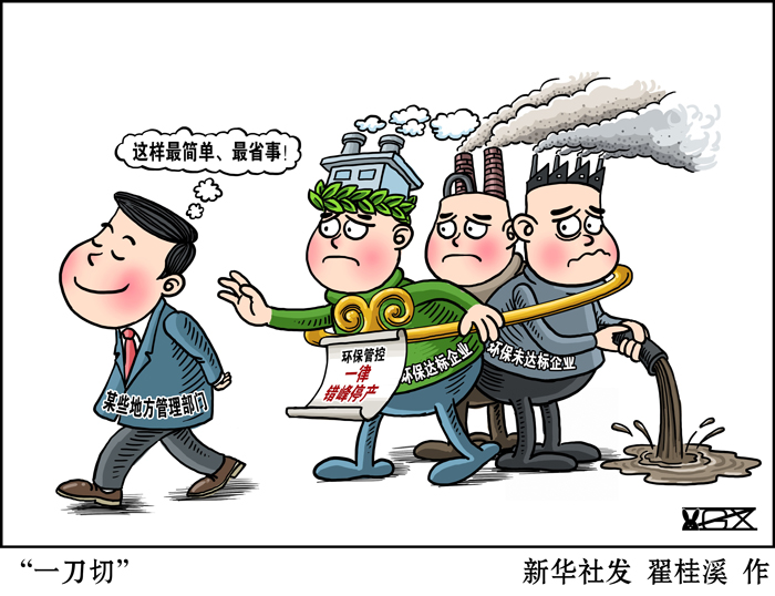 值得注意的是,有些地方“一刀切”政策開始搞移花接木。中部多家企業的相關負責人反映,遇到上級部門前來檢查、督查時,地方政府擔心指標不符合要求,就讓企業一律采取停產應對。可在對外發布消息時,卻說成“企業停產檢修”“企業升級改造設備”,本是地方的“一刀切”要求,卻搖身一變成為企業的“自行選擇”。