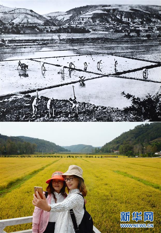 這是一張拼版照片,上圖為抗戰時期延安南泥灣的生產場景(資料圖片);下圖為2018年9月12日,游客在延安南泥灣稻田旁留影(新華社記者劉瀟攝)。新華社發