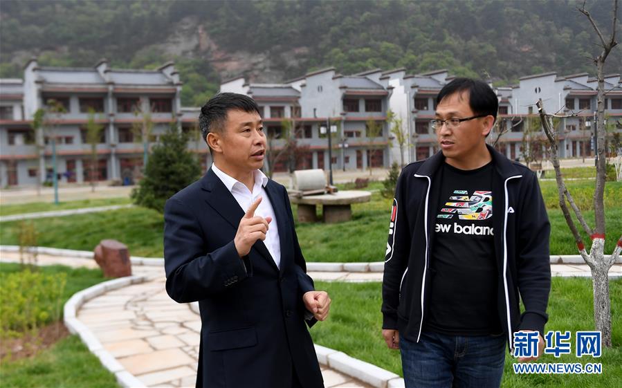 陜西延安黃陵縣雙龍鎮索洛灣村黨支部書記柯小海(左)和村干部在交流村里發展情況(4月28日攝)。新華社記者 劉瀟 攝