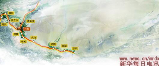 打開地圖,沿著古絲綢之路一路向西,在敦煌分了一個岔,一路向北的叫北線,一路向南的叫南線,中間隔著塔克拉瑪干大沙漠。南線沿著沙漠邊緣,在昆侖山脈水系的滋潤下,出現(xiàn)一串珍珠似的綠洲:樓蘭、于田、莎車……