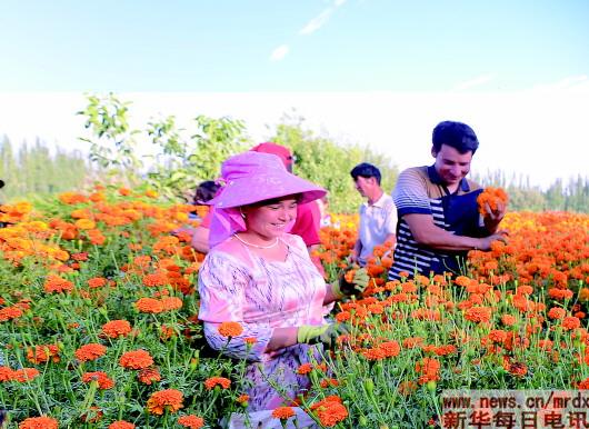 2019年7月,在新疆莎車縣依蓋爾其鎮(zhèn),依乃克帕塔村維吾爾族農(nóng)民們正忙著采摘萬壽菊。在每年6月到9月的花期,每10天可采摘一次,一年最多可采摘8至10次。