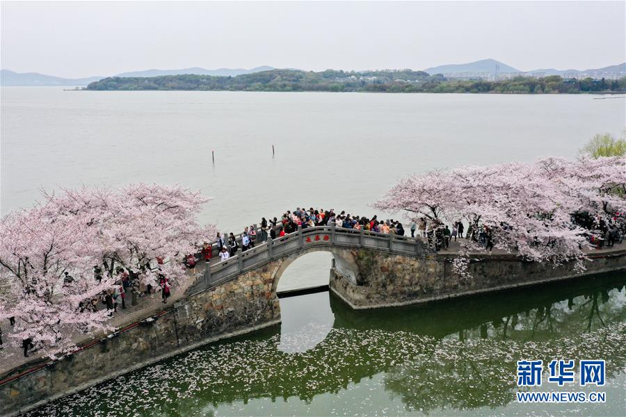 游客在江蘇無錫太湖黿頭渚風景區內賞櫻(4月2日無人機拍攝)。新華社記者 李博 攝