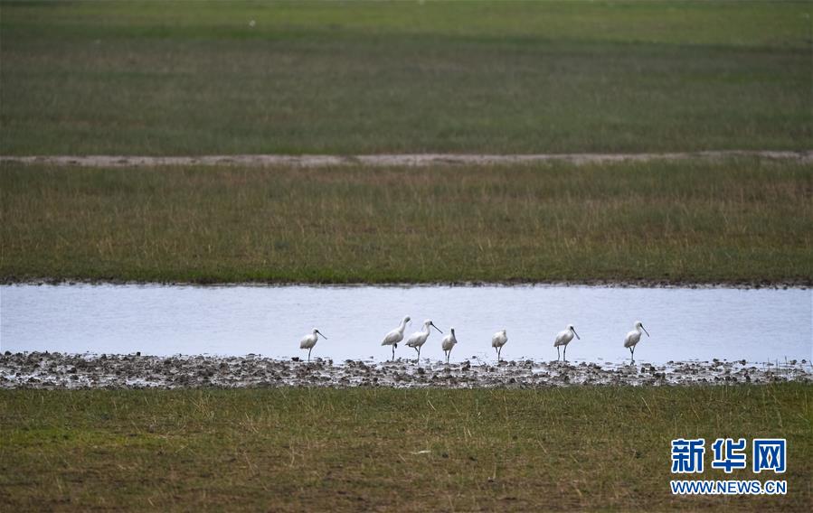 在位于江蘇鹽城東部沿海的大豐麋鹿國家級自然保護區,一群黑臉琵鷺在水邊棲息(6月27日攝)。新華社記者 李響 攝