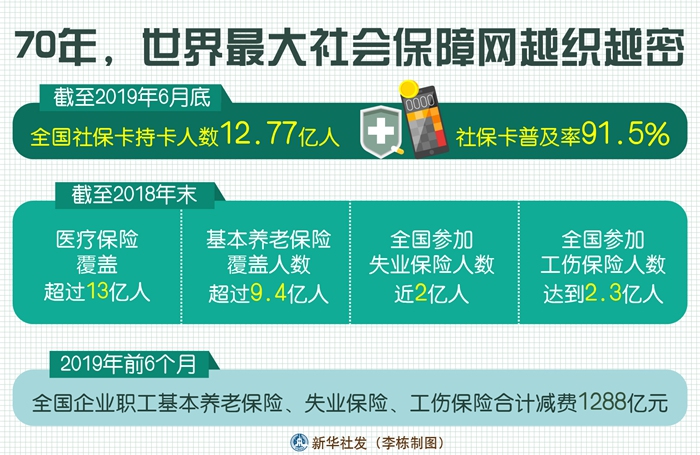 1951年2月26日,新中國成立后第一個社會保險法規(guī)《中華人民共和國勞動保險條例》頒布。70年來,一系列政策措施頒布實(shí)施,給老百姓帶來實(shí)實(shí)在在、看得見摸得著的好處。社會保障不斷加強(qiáng),織就世界最大的社會保障網(wǎng)。