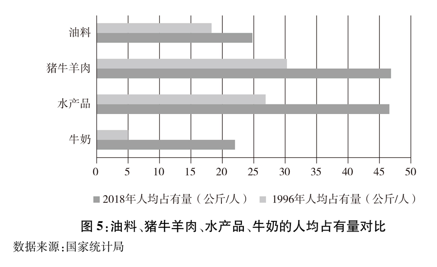 圖5:油料、豬牛羊肉、水產(chǎn)品、牛奶的人均占有量對比 新華社發(fā)