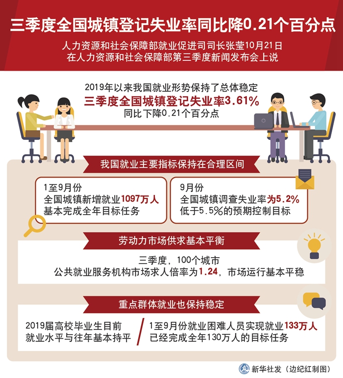 新華社北京10月21日電(記者王優(yōu)玲)人力資源和社會保障部就業(yè)促進司司長張瑩21日說,今年以來我國就業(yè)形勢保持了總體穩(wěn)定,三季度全國城鎮(zhèn)登記失業(yè)率3.61%,同比下降0.21個百分點。