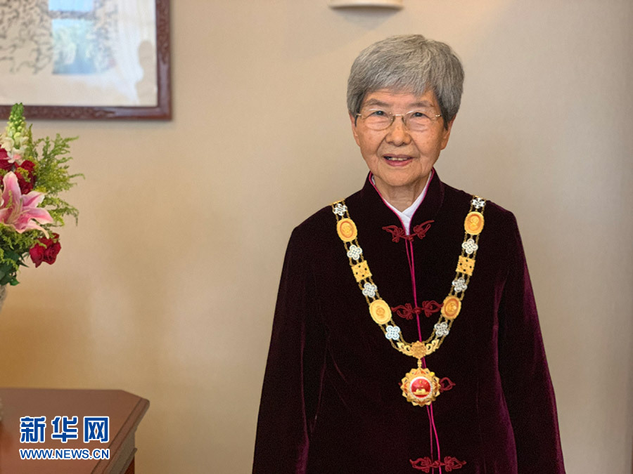 佩戴國家榮譽稱號獎章的樊錦詩(9月29日攝)。新華社發(敦煌研究院供圖)