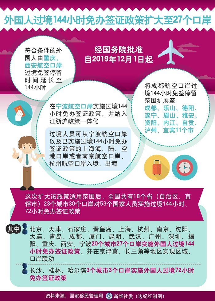 新華社北京10月23日電 記者23日從國家移民管理局新聞發布會獲悉,隨著我國對外開放不斷深入,中外交流不斷深化,為進一步促進經濟社會發展和中外人員往來,經國務院批準,自2019年12月1日起,符合條件的外國人由重慶、西安航空口岸過境免簽停留時間延長至144小時;在寧波航空口岸實施過境144小時免辦簽證政策,并納入江浙滬政策一體化,過境人員可從寧波航空口岸以及已實施過境144小時免辦簽證政策的上海海、陸、空港口岸或者南京航空口岸、杭州航空口岸入境、出境;將成都航空口岸過境144小時免簽停留范圍擴展至成都、樂山、德陽、遂寧、眉山、雅安、資陽、內江、自貢、瀘州、宜賓11個市。