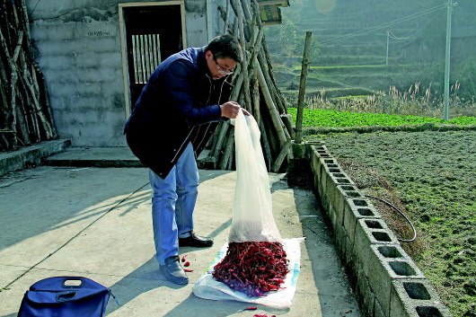 楊運大到貧困戶家里走訪,幫助曬辣椒。