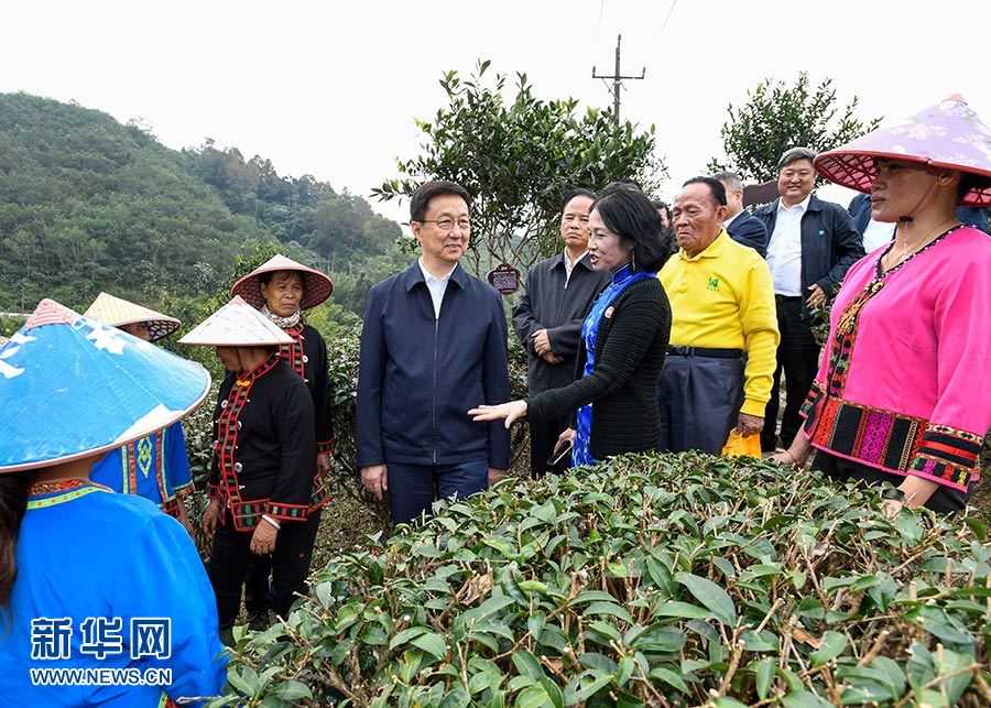 11月9日至11日,中共中央政治局常委、國務院副總理韓正在海南調研。圖為11月10日,韓正在五指山椰仙有機茶生態觀光園,了解高山雨林有機茶種植等特色產業培育、病蟲害物理防治、種植產業和旅游產業融合發展等情況,與正在茶園工作的當地農民和貧困戶交流。 新華社記者 高潔 攝