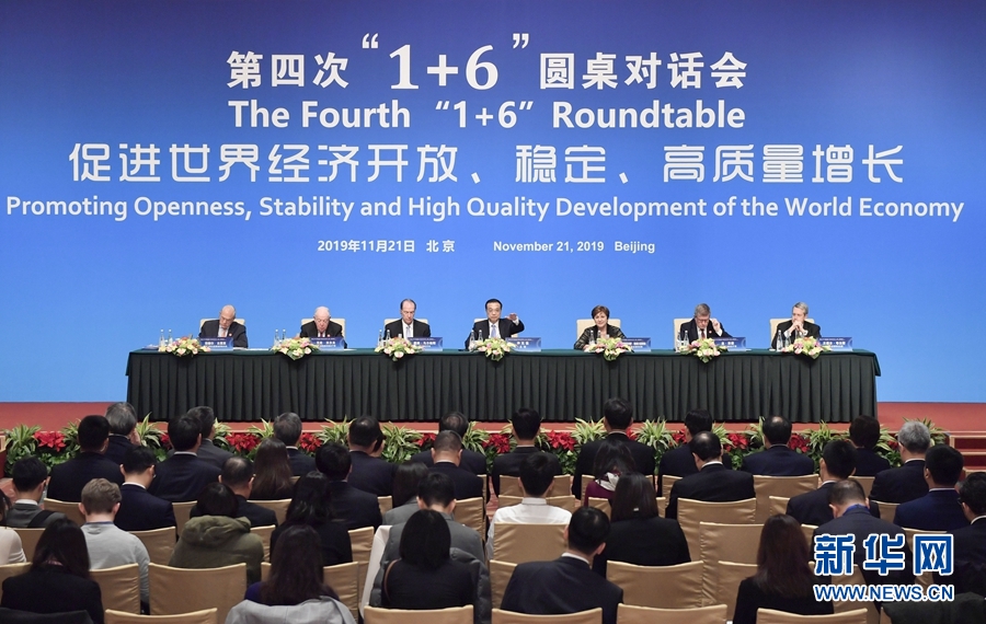 新華社北京11月21日電 國務院總理李克強21日在釣魚臺國賓館同世界銀行行長馬爾帕斯、國際貨幣基金組織總裁格奧爾基耶娃、世界貿易組織副總干事沃爾夫、國際勞工組織總干事賴德、經濟合作與發展組織秘書長古里亞和金融穩定理事會主席夸爾斯舉行第四次“1+6”圓桌對話會后共同會見了記者。
