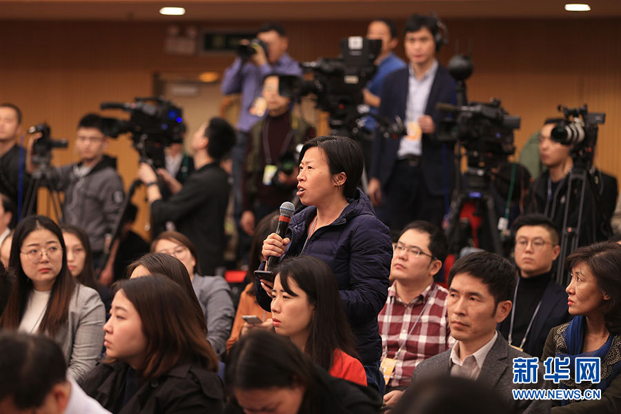全國政協十三屆二次會議3月5日15:00在梅地亞中心多功能廳舉行記者會,邀請5位全國政協委員就“打贏防范化解重大風險、精準脫貧、污染防治三大攻堅戰”回答記者提問。圖為英國泰晤士報記者提問。新華網/中國政府網 劉廈 攝