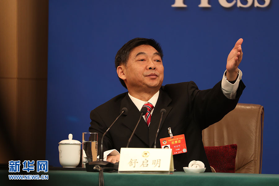 全國政協十三屆二次會議3月5日15:00在梅地亞中心多功能廳舉行記者會,邀請5位全國政協委員就“打贏防范化解重大風險、精準脫貧、污染防治三大攻堅戰”回答記者提問。圖為主持人舒啟明。新華網/中國政府網 陳杰 攝