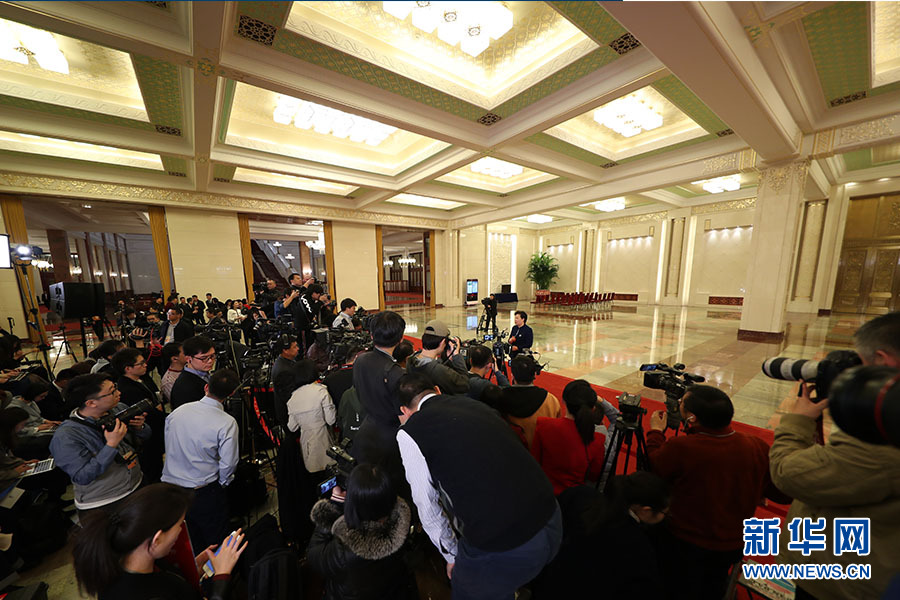 3月8日,2019年全國兩會第三場“部長通道”在人民大會堂舉行。部長們在這里直面熱點,回應(yīng)關(guān)切。這是記者在“部長通道”采訪。新華網(wǎng)/中國政府網(wǎng) 陳杰 攝