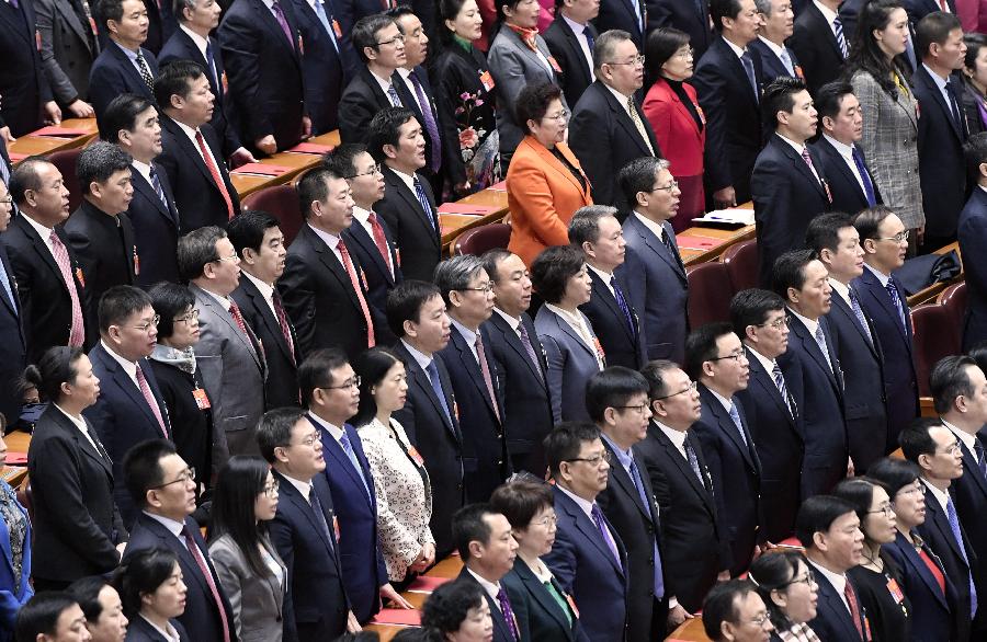 3月15日,第十三屆全國人民代表大會第二次會議在北京人民大會堂舉行閉幕會。這是代表在唱國歌。 新華社記者 高潔 攝
