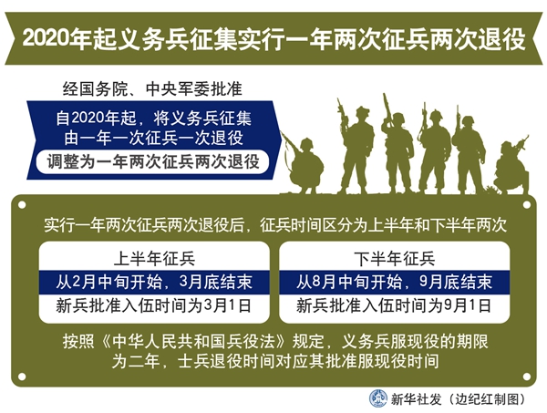 新華社北京1月16日電(記者賈啟龍)經國務院、中央軍委批準,自2020年起,將義務兵征集由一年一次征兵一次退役,調整為一年兩次征兵兩次退役。