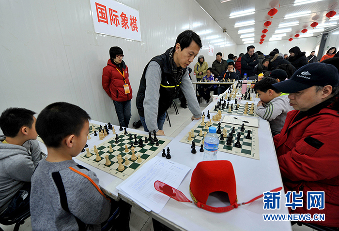 2013年2月13日,在北京龍?zhí)稄R會(huì)上,國(guó)際象棋大師李文良與多名業(yè)余棋手下棋。(圖片來(lái)源:新華社)