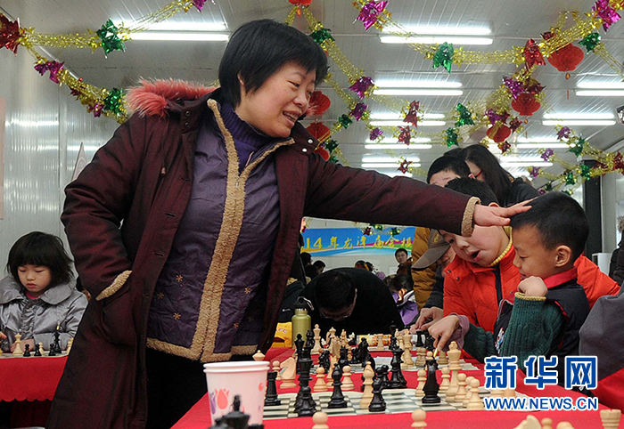 2014年2月4日,國(guó)際象棋世界冠軍謝軍(左)在龍?zhí)稄R會(huì)活動(dòng)現(xiàn)場(chǎng)與一位小朋友交流。(圖片來(lái)源:新華社 記者 公磊攝)