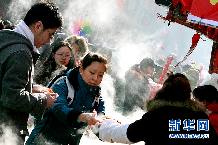 2008年2月6日,游客在北京地壇春節(jié)廟會(huì)上挑選風(fēng)味小吃。(圖片來(lái)源:新華社 張迺杰攝)