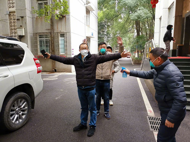 ↑ 2020年1月23日,新華社記者采訪結束后,用酒精進行人車消毒。