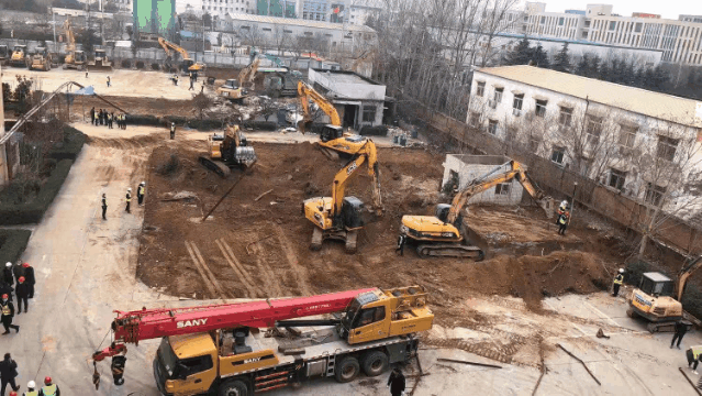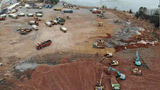 經過一天一夜施工,新型冠狀病毒隔離房項目入場挖機41臺,推土機15臺,壓路機4臺,自卸車40臺,327名管理人員和336名工人集結完畢,累計平整全部場地9000平方米,內轉土方2500立方米。