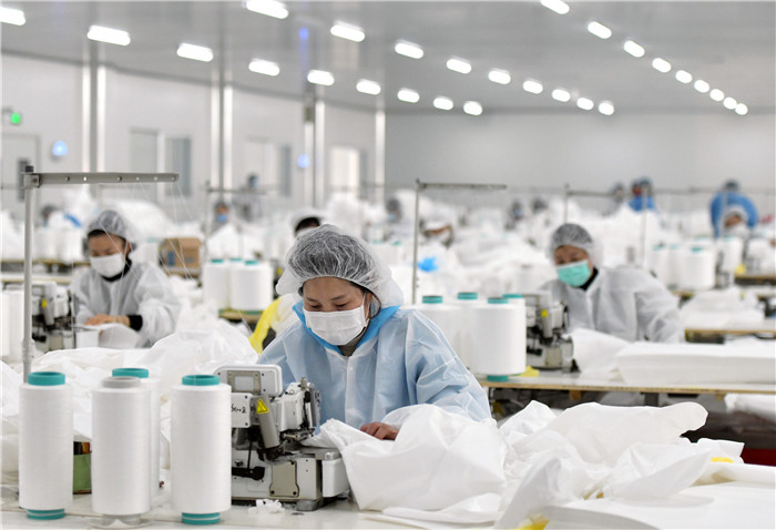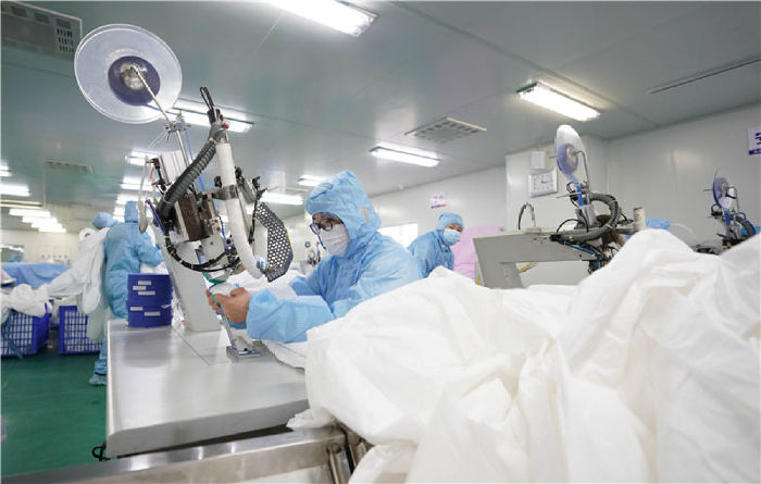1月28日,在武漢市新洲區武漢協卓衛生用品有限公司,工人在趕制防護服,該公司是生產手術服、防護服等產品的企業。 新華社記者 才揚 攝