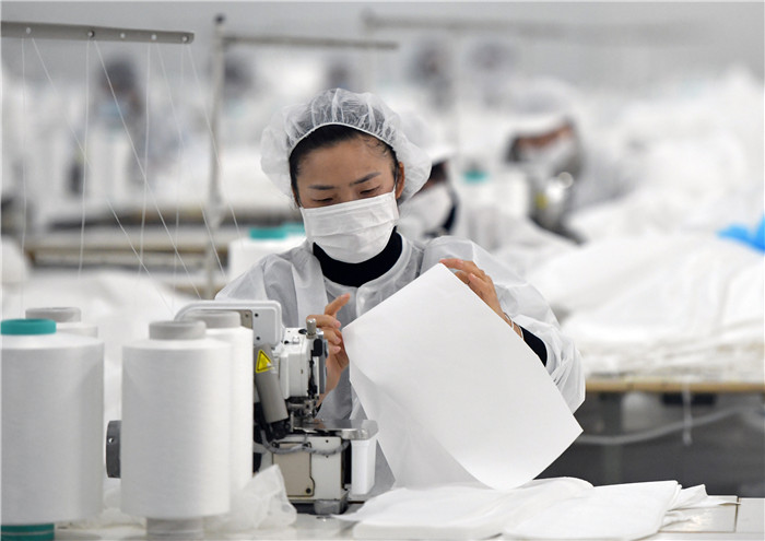 1月28日,在仙桃市湖北裕民防護用品有限公司生產車間內,工人在加緊生產醫用防護用品。 新華社記者 李賀 攝