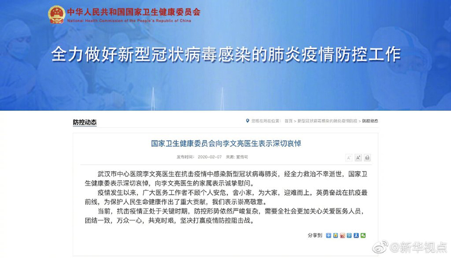國家衛(wèi)生健康委員會(huì)向李文亮醫(yī)生表示深切哀悼-新華網(wǎng)
