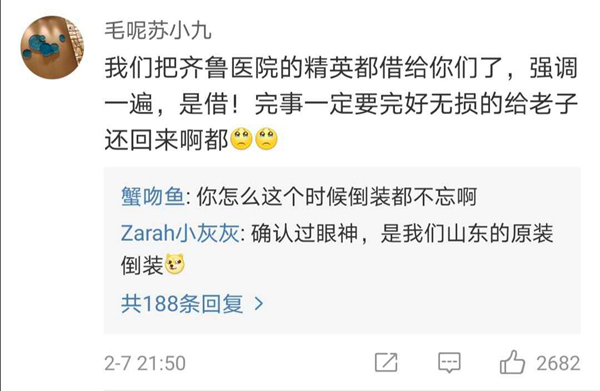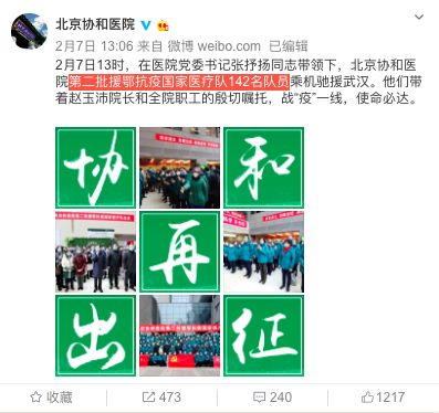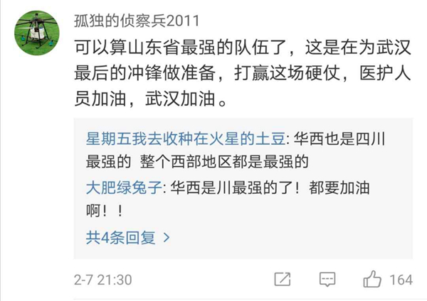 有網友表示,北協和、南湘雅、東齊魯、西華西,中國醫療界最頂尖的王炸帶上各省份的天團會師武漢!今天看到最戳心的一句話是:全村的龍已把最硬的麟給你,哪怕自己也傷痕累累,所以,武漢,加油!