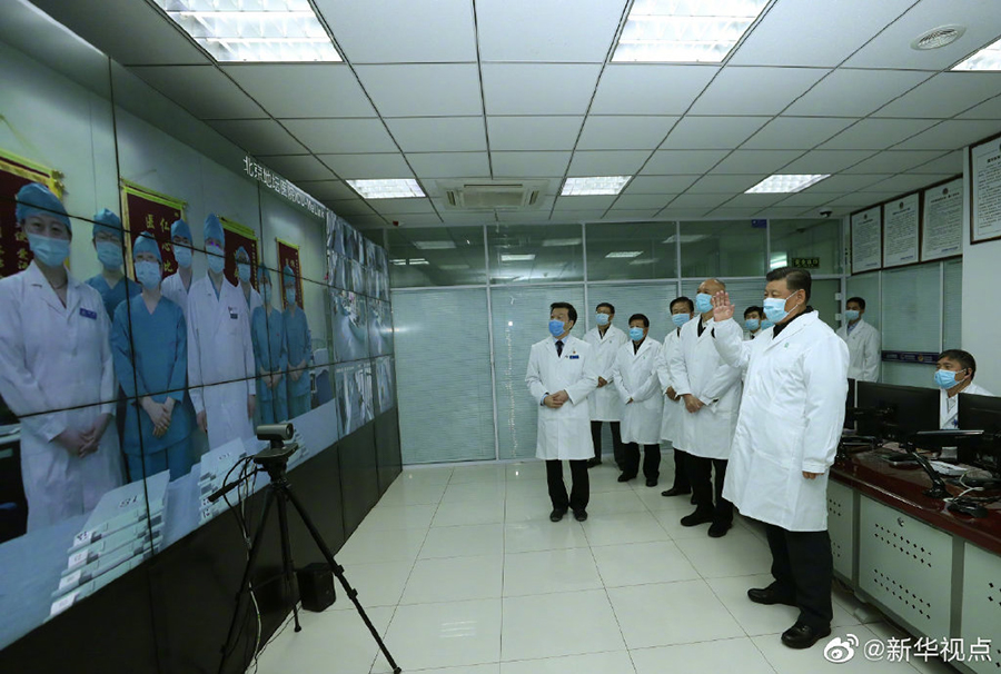 10日下午,習近平總書記來到首都醫科大學附屬北京地壇醫院,視頻連線正在病房值班的醫務人員,了解患者救治情況,聽取意見和建議,并向全國奮戰在抗擊疫情一線的廣大醫務工作者致以崇高敬意和衷心感謝。他叮囑大家做好自我防護,避免感染減員。他要求各方面做好后勤保障,生活、安全、人文關懷等要跟上,不要讓一線醫務工作者受委屈。(文字記者張曉松 攝影記者鞠鵬、謝環馳)