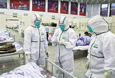 2月8日,醫務人員在武漢客廳方艙醫院查房。新華社發