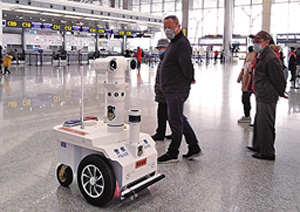 “請大家戴好口罩,注意個人衛生,不要前往人流密集場所……”連日來,在廣州、上海、貴陽等地人員較為密集的公共場所,都能看到一個長著“大眼睛”的機器人不知疲倦地來回喊話,這是誕生于廣州市黃埔區的國內首款用于測體溫的巡邏機器人——“千巡警用巡邏機器人”。這款機器人能夠對5米范圍內10人同時紅外測溫、誤差不超過0.5攝氏度,有效減少了警務人員因為人員接觸交叉感染的風險。