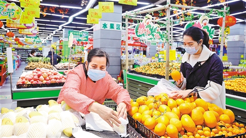 2月10日,市民在江西省宜豐縣華聯超市選購水果。連日來,該縣加強物資統籌調配,確保物價穩定。 何賤來攝(中經視覺)