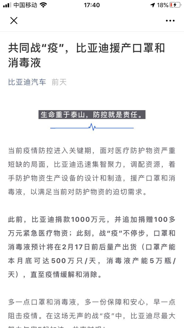 2月8日,“比亞迪汽車”微信號一篇《共同戰“疫”,比亞迪援產口罩和消毒液》引發網友關注,文章稱,比亞迪將在2月17日前后預計量產出貨口罩和消毒液(口罩產能本月底可達500萬只/天,消毒液產能5萬瓶/天),直至疫情緩解和消除。