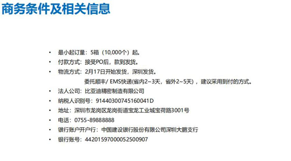 與此同時,《比亞迪賣口罩了》pdf文件也在網上流傳,文件內容顯示,口罩制造的法人公司為比亞迪精密制造有限公司,最小起訂量為5箱(10000個)起,2月17日開始從深圳發貨。快遞委托順豐/ EMS快遞(省內2-3天,省外2-5天) 。