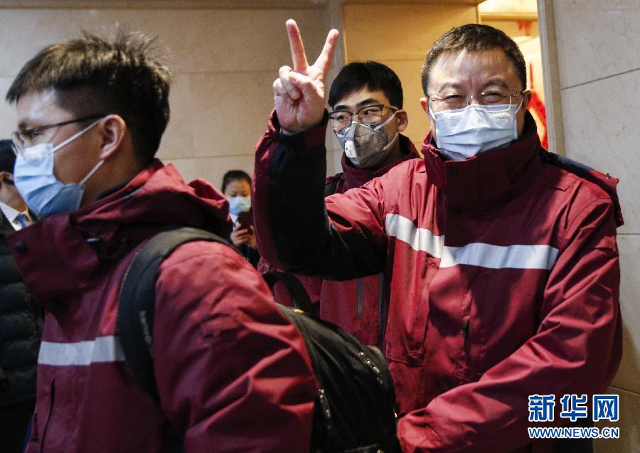 2月1日,中日友好醫院黨委書記周軍(右一)在出發前做出勝利的手勢。當日,為進一步加強武漢新型冠狀病毒感染的肺炎危重癥患者救治工作,國家衛生健康委緊急組派中日友好醫院、北京大學第一醫院、北京大學人民醫院、北京大學第三醫院院長或書記帶領本院重癥醫學科主任、護士長等專業人員奔赴武漢,和前期組派的專業醫務人員一起開展危重癥患者救治工作。 新華社記者 張玉薇 攝
