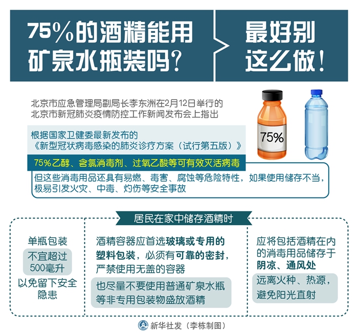 新華社北京2月13日電(記者丁靜)越來越多的人選擇常備75%的乙醇(俗稱酒精)進行家庭和個人消毒。那么,75%的乙醇可以裝在礦泉水瓶里嗎?北京市應(yīng)急管理局副局長李東洲在12日舉行的北京市新冠肺炎疫情防控工作新聞發(fā)布會上稱,最好別這么做。