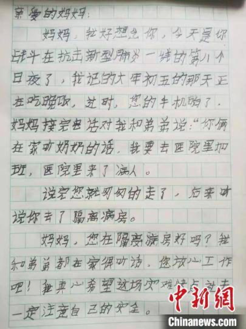 孩子在信中寫道:“媽媽,我好想念你,今天是您戰斗在抗擊新型肺炎一線的第八個日夜了……媽媽,你是我崇拜的英雄。”