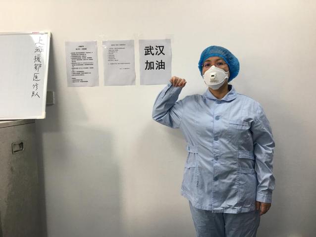 她在“武漢加油”的標語前
