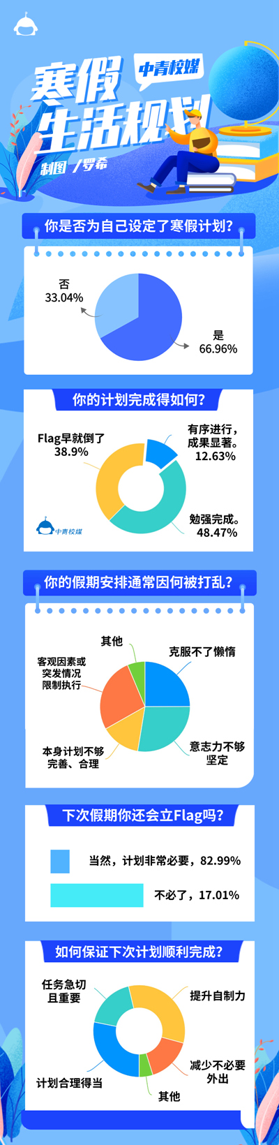 中青校媒調(diào)查顯示,在落實假期計劃時,意志力不夠堅定(63.19%)、客觀因素或者突發(fā)情況(62.36%)、克服不了懶惰(57.88%)、計劃本身不夠合理(33.06%) 等因素都會干擾計劃的執(zhí)行。